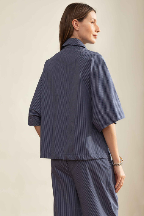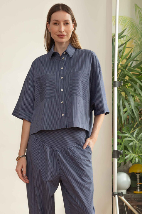 camisa listrada fininha azul claro e marinho em tricoline 100% algodão. camisa shape amplo com bolsos frente e botões, manga inteira e fenda lateral com as costas mais comprida que a frente.