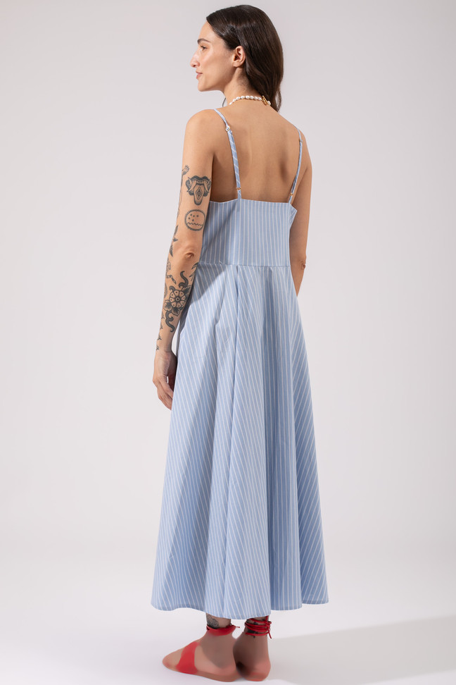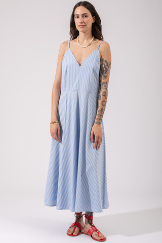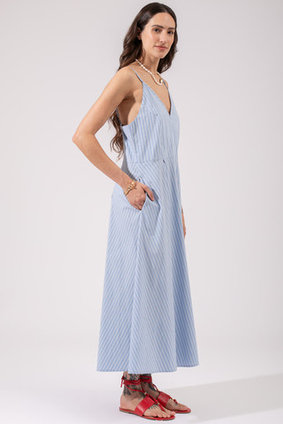 vestido em tricoline de algodão listrada 100%. corpo mais ajustado duplo com decote V, alças com ajustador de metal dourado. ziper invisível na lateral e saia ampla pregas com bolsos frente.