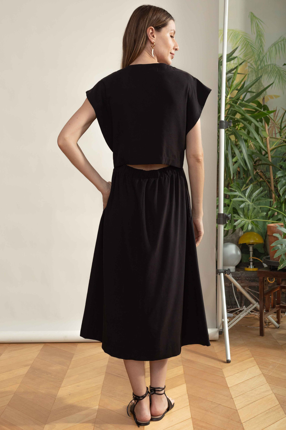 vestido em tecido de viscose opaca. decote careca com abertura nas costas e elástico no cós da saia. corpo com leve franzidos deixado o shape mais solto e bolsos laterais. mangas amplas com taco na cava para não aparecer o sutiã.